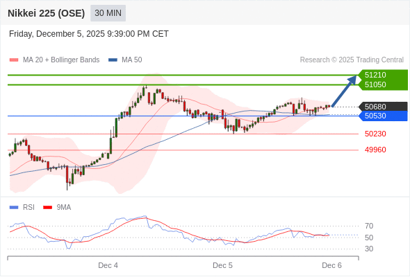 在 50530 之上,看涨,目标价位为 51050 ,然后为 51210 。