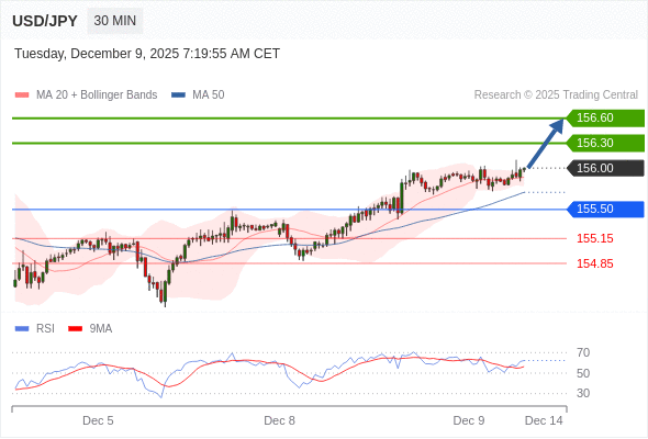 在 155.50 之上,看涨,目标价位为 156.30 ,然后为 156.60 。