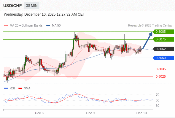 在 0.8050 之上,看涨,目标价位为 0.8075 ,然后为 0.8085 。