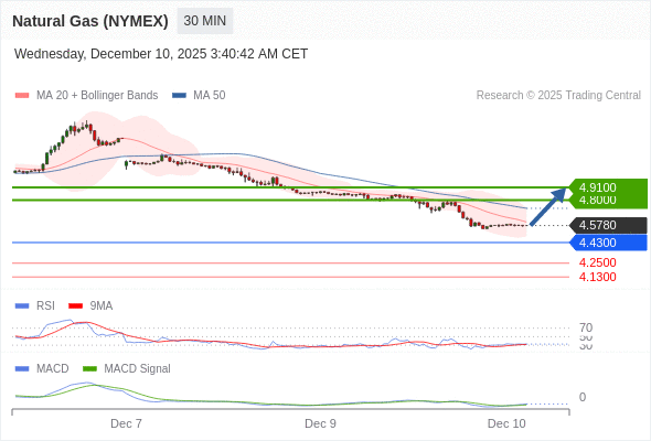备选策略: 如跌破 4.4300 ,Natural Gas (NYMEX) (JAN6) 目标方向定在 4.2500 和 4.1300 。